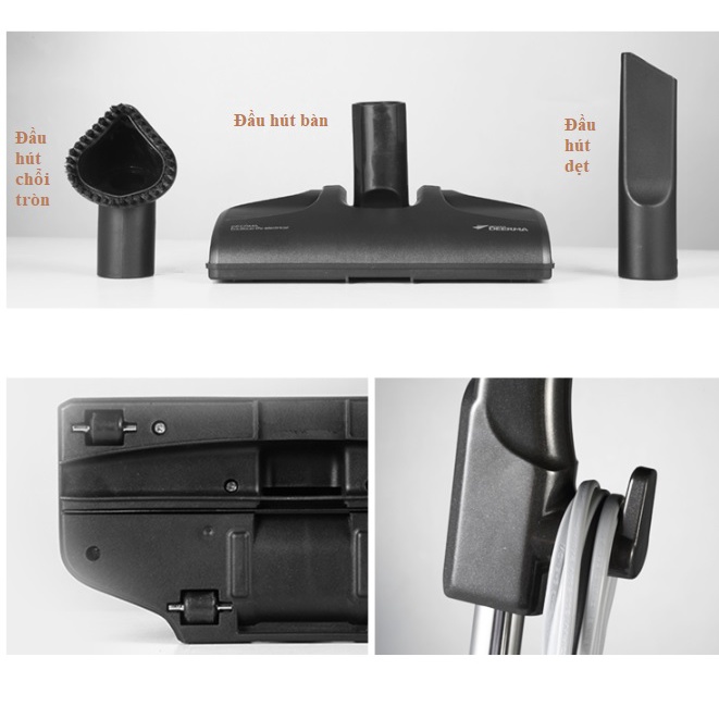 - Máy hút bụi mini cầm tay Deerma có 3 loại đầu hút cho những mục đích làm việc khác nhau, từ đầu hút sàn & bàn chải quay góc 90 độ.