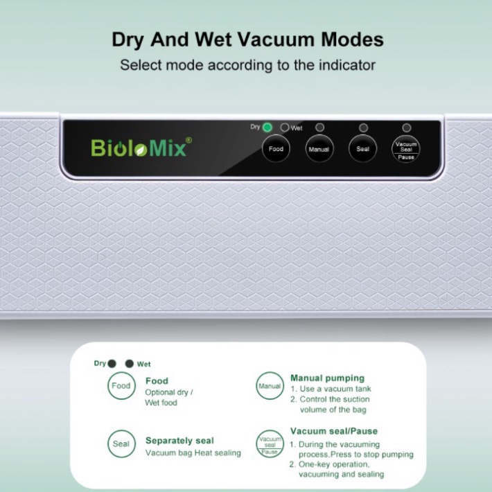 - Hữu ích và thiết thực, máy hút Biolomix sử dụng hệ thống khéo léo được thiết kế để sở hữu hai lựa chọn chế độ hút chân không thực phẩm của bạn với hiệu năng tốt nhất có thể bảo quản dựa trên các loại thực phẩm bạn muốn để bảo quản. Bạn có thể chọn chế độ Dry (Hút đồ khô) cho thực phẩm rắn các mặt hàng và chế độ Wet (Đồ ẩm, ướt)
