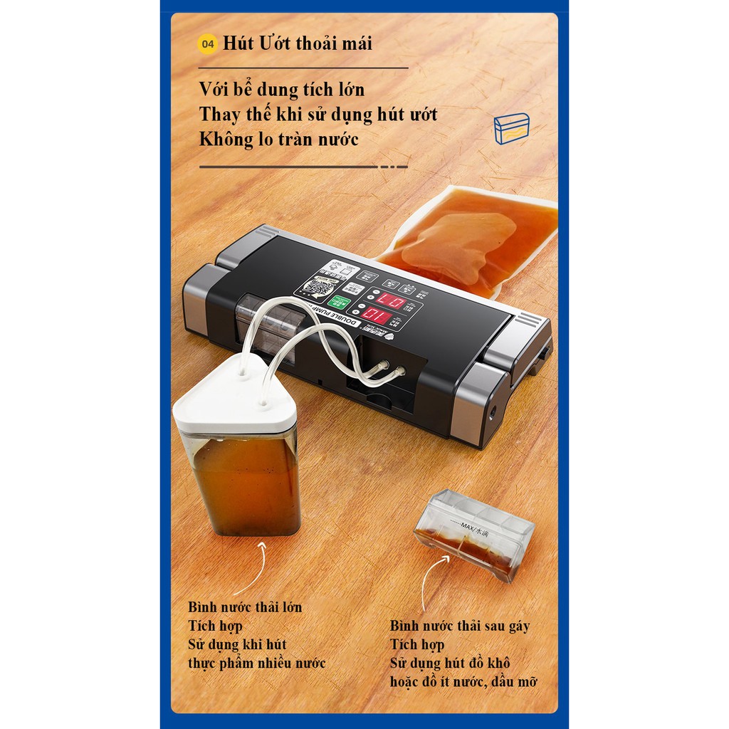 3.Tích hợp bình nước thải 800ml, giúp đóng gói đồ ướt dễ dàng, không phải vệ sinh nhiều lần. Tránh nước thải tràn ra máy khi đang đóng gói