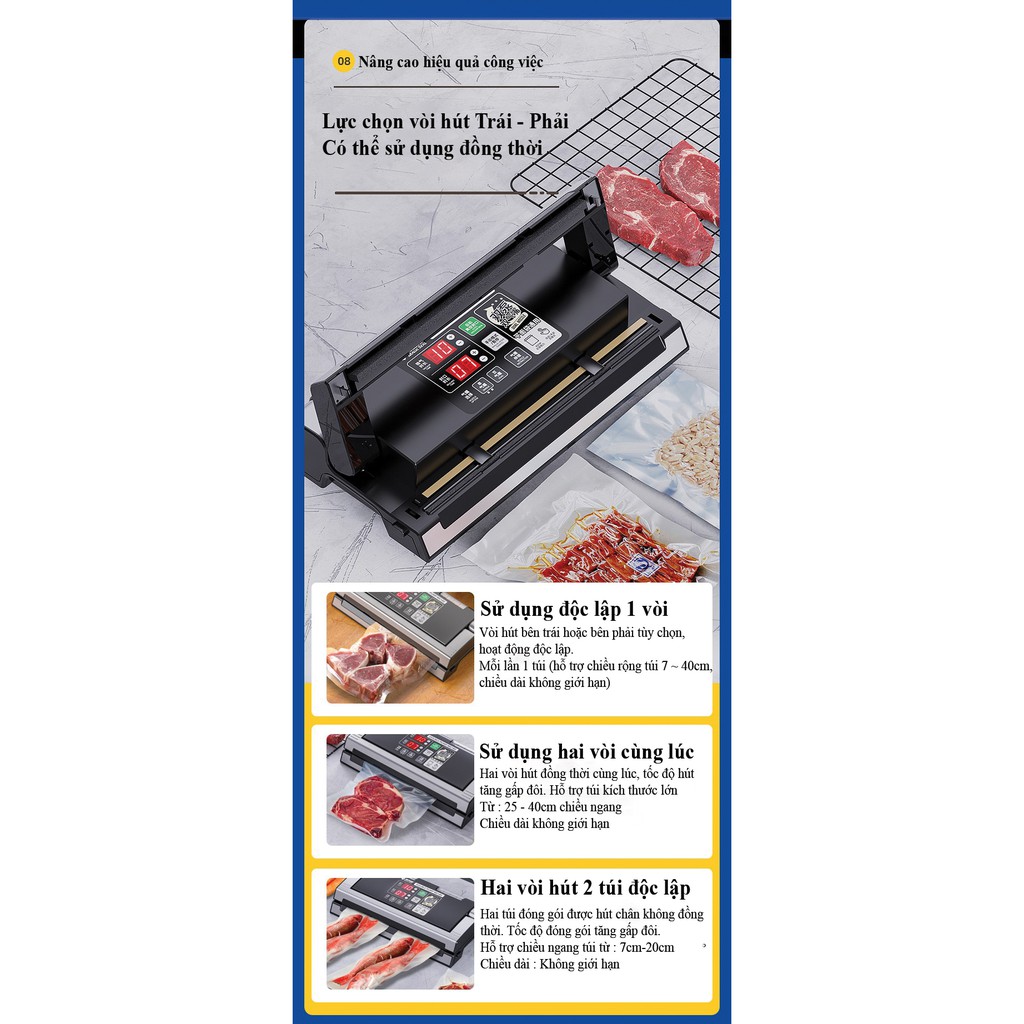 4.Công suất mạnh mẽ với hai vòi hút, giúp hút mạnh và tăng tốc trong việc đóng gói bảo quản.