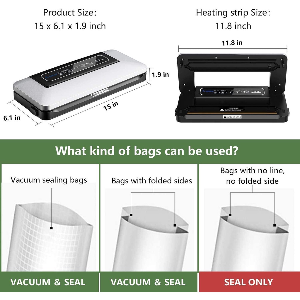 🍒 【MUITI-MODES: TÙY CHỈNH KHU VỰC CỦA BẠN】 Hệ thống niêm phong chân không AOBOSI được thiết kế với hai chế độ có thể lựa chọn (Chế độ nhẹ nhàng & bình thường và Chế độ ẩm & khô) để cung cấp cho thực phẩm của bạn sự bảo quản tốt nhất có thể dựa trên loại thực phẩm bạn muốn niêm phong. Chức năng dừng có thể kiểm soát thêm áp suất chân không. Chức năng thực có thể niêm phong túi chỉ trong 12 giây mà không gây tiếng ồn. Ngoài ra còn có niêm phong chân không tự động, cung cấp một cách đơn giản và nhanh chóng để niêm phong thực phẩm yêu thích của bạn.