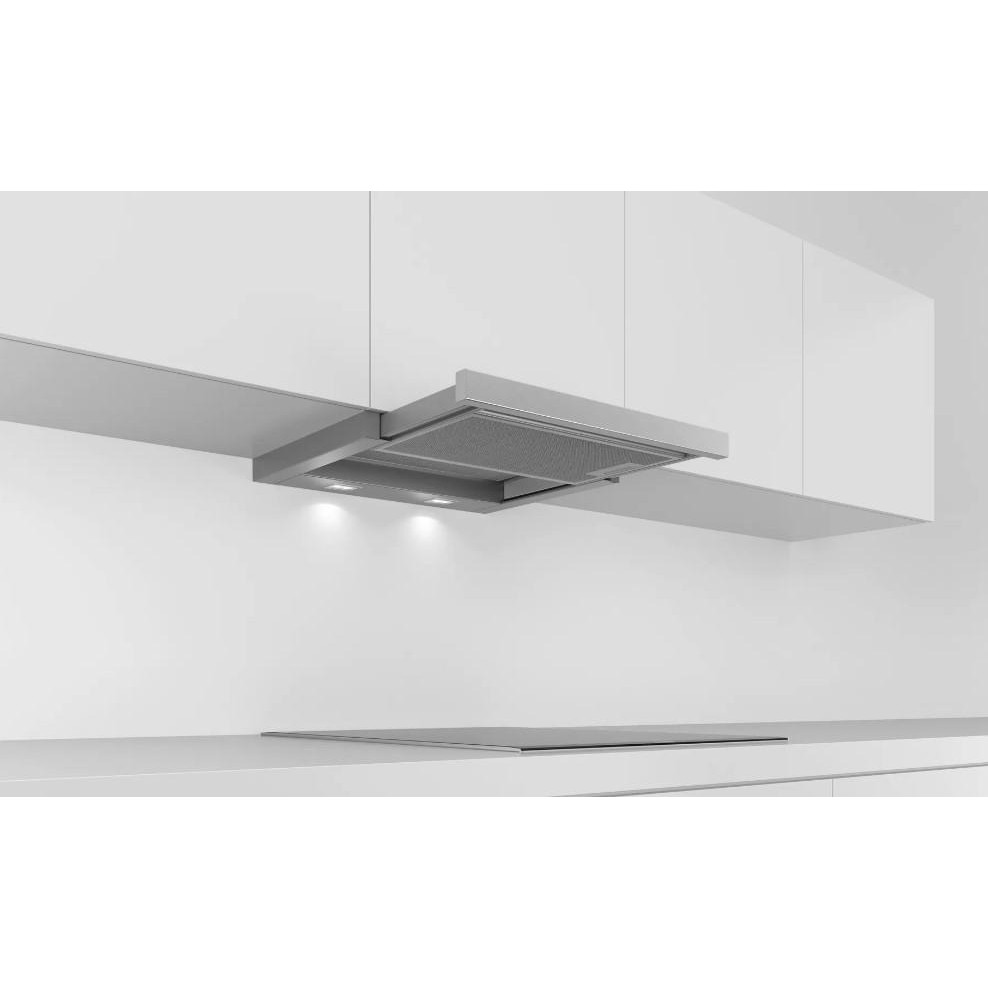 - Máy hút mùi Bosch DFR067A50 được thiết kế theo kiểu âm tủ, phần động cơ máy hút mùi có thể giấu bên trong tủ giúp tiết kiệm diện tích không gian bếp nấu.