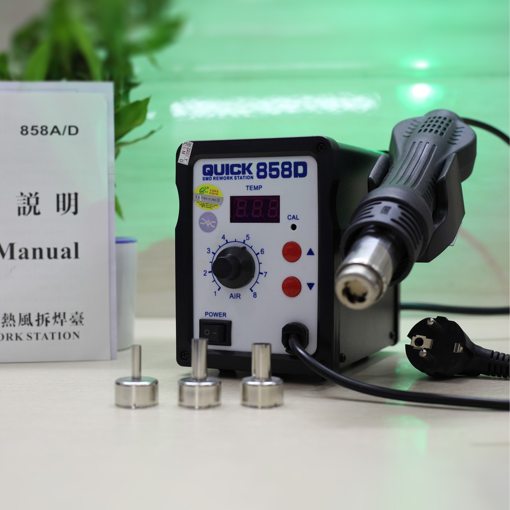 Máy khò Quick 858D dùng để khò nhổ chip sửa bảng mạnh điện tử, hàn chảy que thiếc, sấy decal skin...Gọn nhẹ, không gây ồn, điều khiển nhiệt và gió chính xác, độ bền cao.