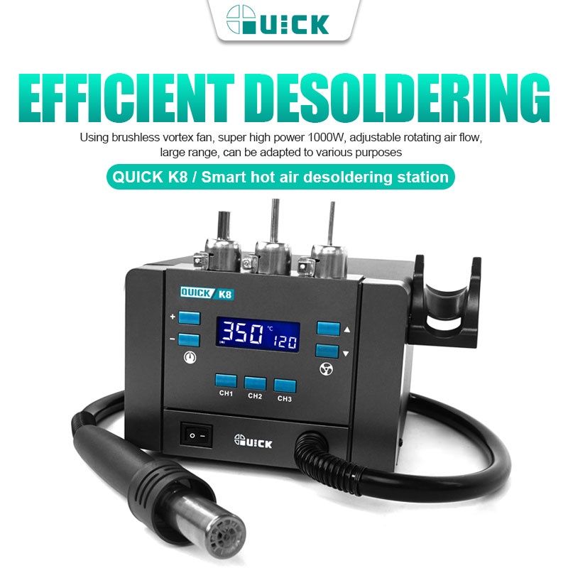 Máy khò Quick K8 chính hãng 2022 là máy khò tầm trung cận cao cấp, trên phân khúc trung cấp với công suất mạnh mẽ 1000WVới 3 kênh nhớ có thể thiết lập mức nhiệt độ và mức gió phù hợp với từng công việc, và giúp chuyển đổi nhanh, dễ dàng