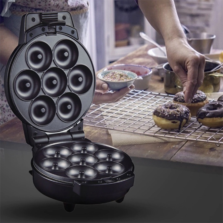 - Khay nướng chống dính với bề mặt rộng, có thể nướng cùng lúc 7 chiếc bánh donut