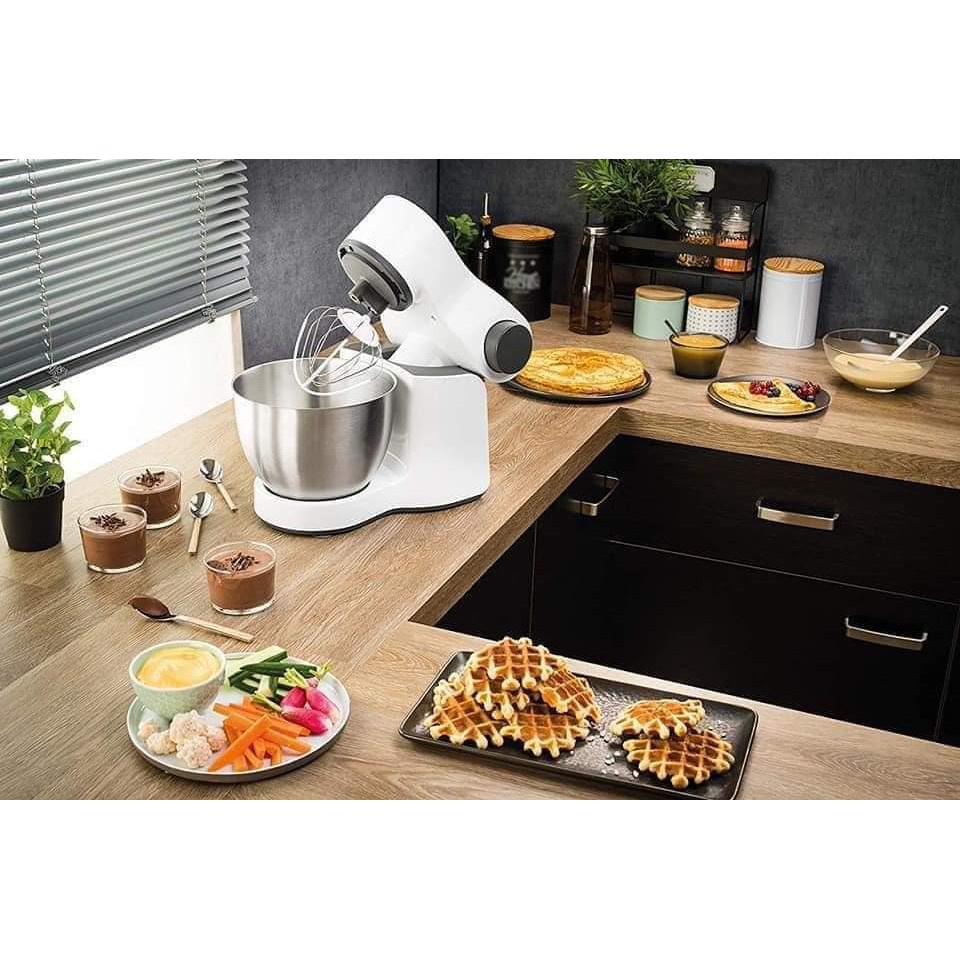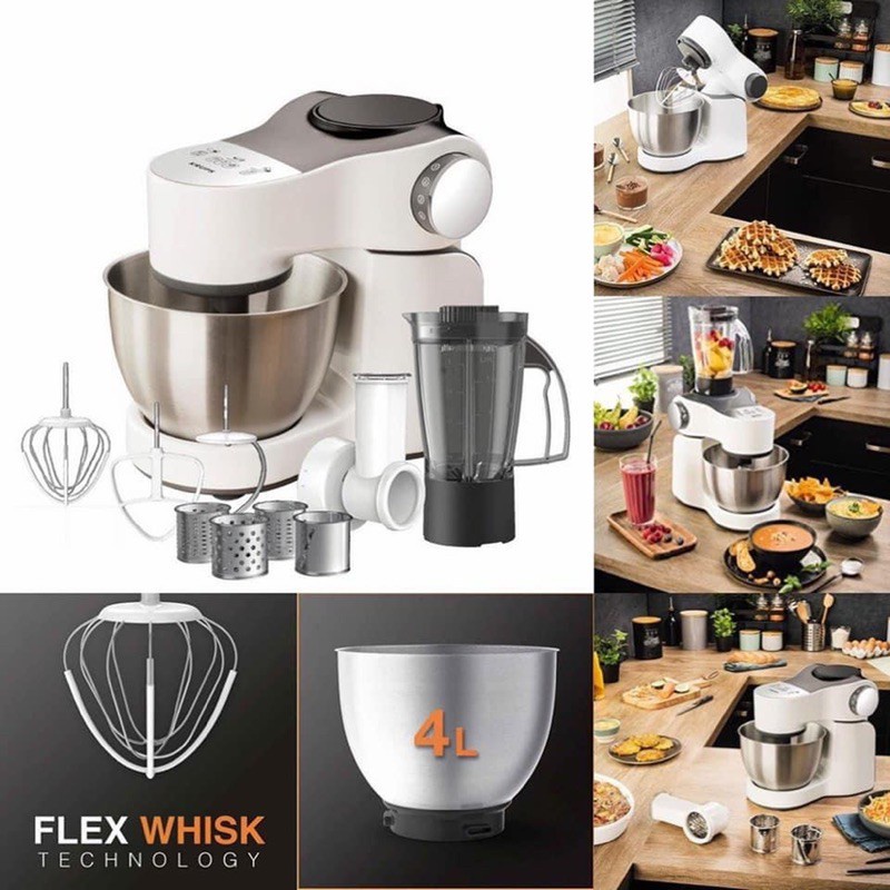 🍰 Phụ kiện đa năng: phới bột nhẹ, phụ kiện "Flex Whisk" đánh trứng, móc nhào bằng thép không gỉ cho bột nặng, máy xay sinh tố, dụng cụ bào, nạo củ quả kèm 4 ống mắt