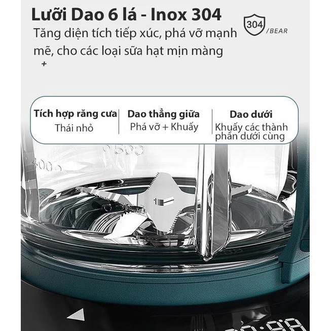 - Lưỡi xay bằng inox 304 không gỉ, an toàn, cối xay thủy tinh chịu nhiệt tới 3500 độ, phần vỏ máy được làm từ nhựa PP, cách nhiệt, cách điện, chống rò rỉ điện