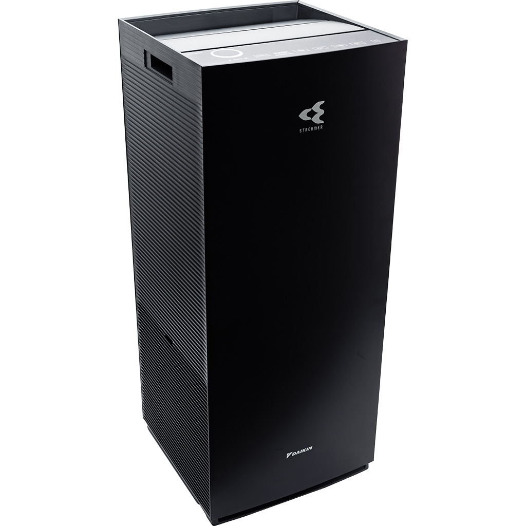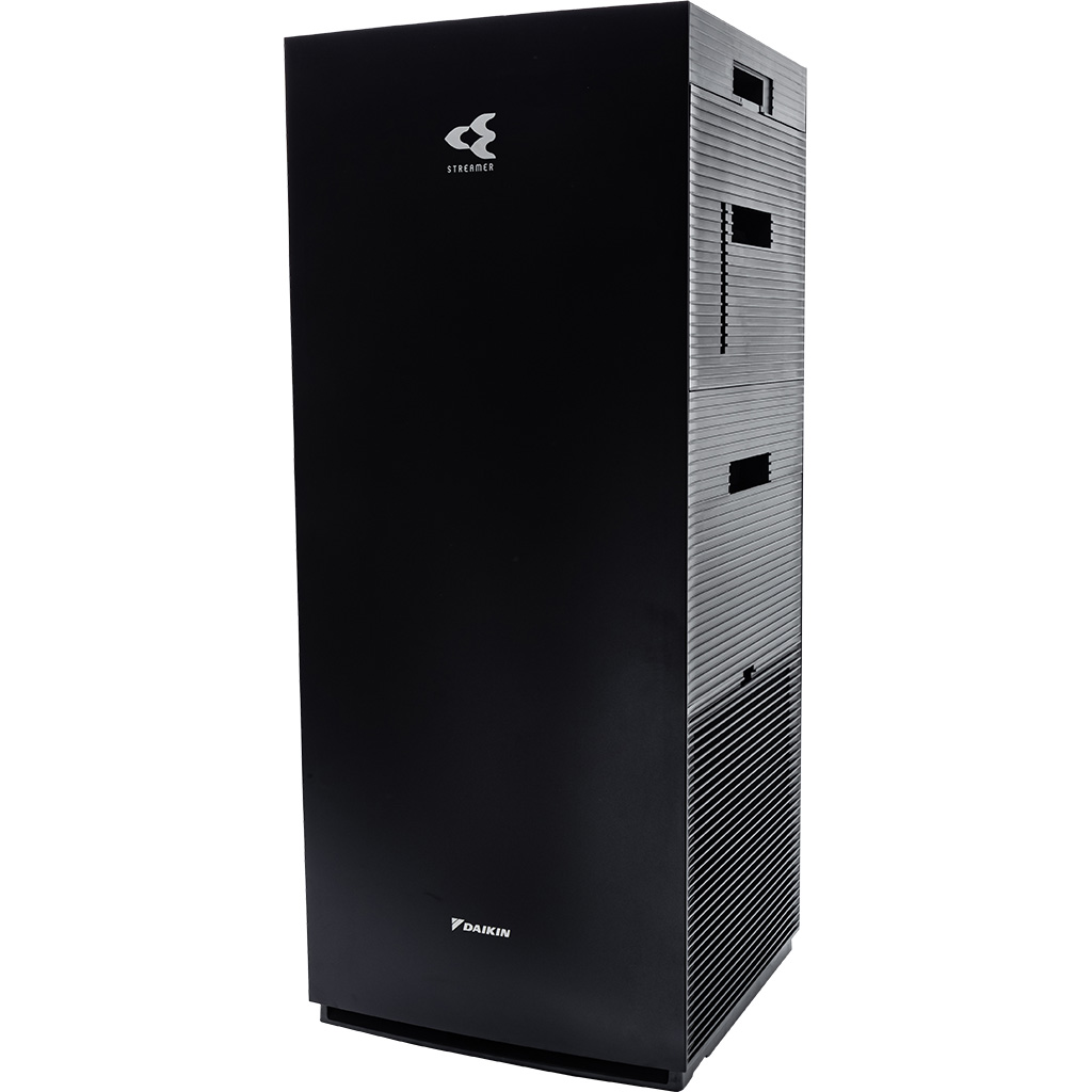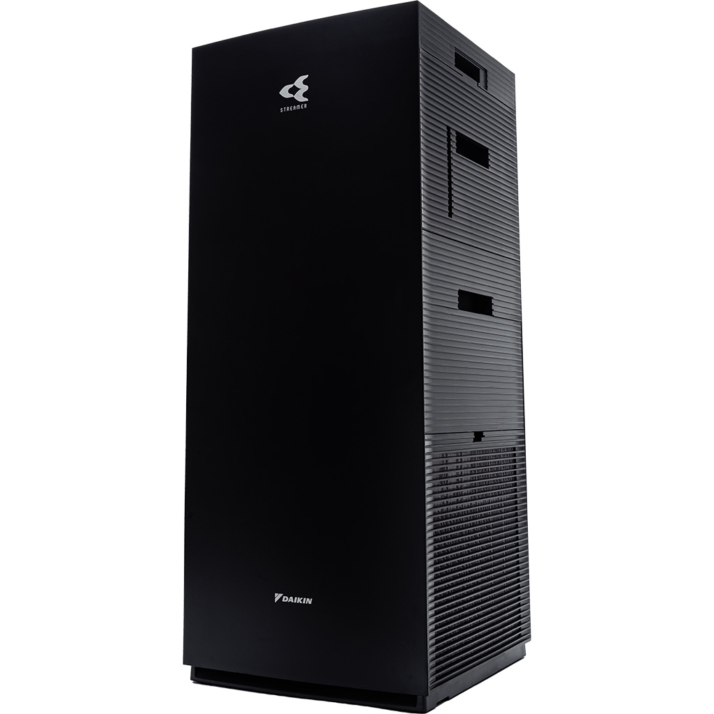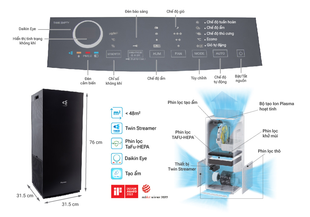 Máy lọc không khí Daikin diện tích lọc khí lớn lên đến 48m² 3 lớp phin lọc tuổi thọ cao: 1. Phin lọc bụi thô 2. Phin lọc mùi không cần thay thế 3. Phin lọc bụi TAFU HEPA hiệu suất cao chống thấm nước và dầu, lọc sạch đến 99.97% bụi 0.3µm , tuổi thọ đến 10 năm Twin Streamer: phóng điện plasma gấp đôi, nâng cao hiệu quả chiếu xạ lên bộ lọc, ức chế vi khuẩn, virus, các chất gây hại Công nghệ Twin Streamer ức chế các chất độc hại bên trong và Ion plasma ức chế các chất gây hại lơ lửng trong không khí Có chức năng tạo ẩm với nhiều chế độ Yên tĩnh/thấp/tiêu chuẩn/turbo và Phin tạo ẩm hiệu quả lên đến 10 năm Đèn báo chất lượng không khí Daikin-Eye: hiển thị tình trạng không khí gồm PM2.5/nhiệt độ/độ ẩm Đèn cảm biến giúp cảm biến độ ẩm, các hạt bụi PM2.5 và mùi trong không khí Thiết kế hình tháp thông minh, hút gió 3 hướng để lọc sạch rồi tuần hoàn khí sạch khắp phòng Vận hành cực kỳ êm ái với độ ồn tối thiểu chỉ 18dB ở chế độ Yên tĩnh