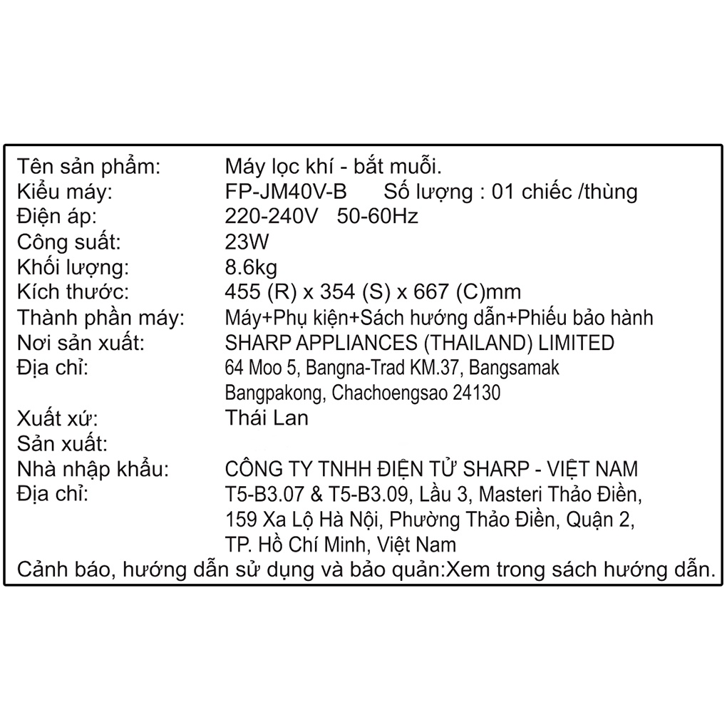 Thiết Bị Điện Gia Dụng > Thiết bị điện gia dụng nhỏ > Thiết bị xử lí không khí > Máy lọc không khí || [Mã ELHA22 giảm 5% đơn 300K] Máy lọc không khí Sharp FP-JM40V-BCòn hàng