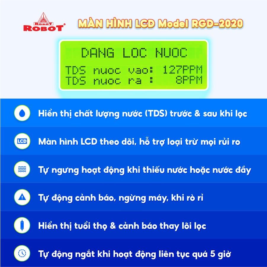 - Các sản phẩm máy lọc nước ROBOT đều sở hữu màn hình LCD sắc nét, hiển thị chi tiết các thông số TDS – chất lượng nước trước & sau lọc, tuổi thọ lõi lọc 24/24… để mọi người đều dễ dàng theo dõi hoạt động máy, chất lượng nước uống thông qua màn hình LCD, loại trừ mọi rủi ro, mang đến sự an toàn tuyệt đối khi sử dụng.