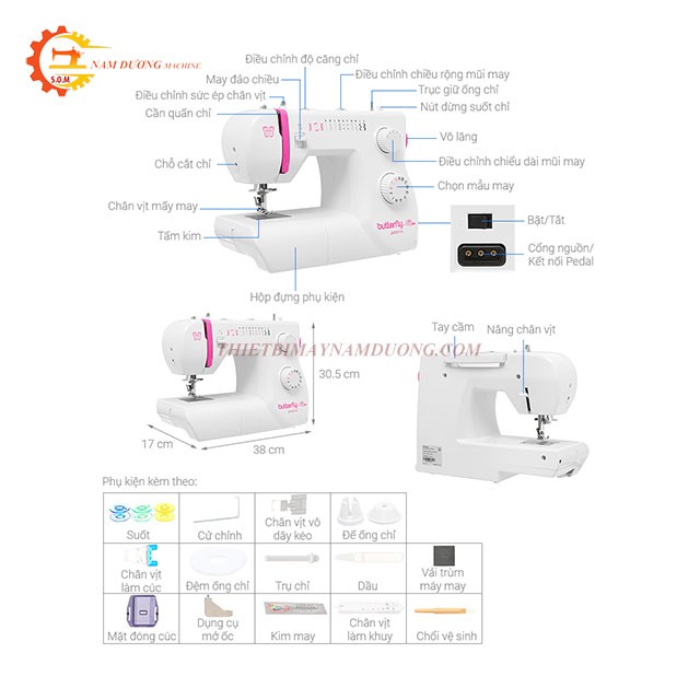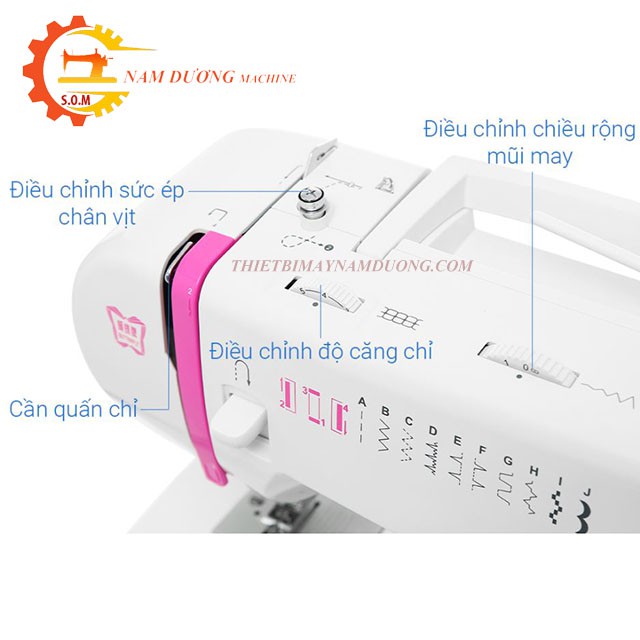 Chế độ: Làm khuy 4 bước ,Vắt sổ ( nếu thay chân vịt hỗ trợ) ,May thêu chữ lồng , May đảo chiều