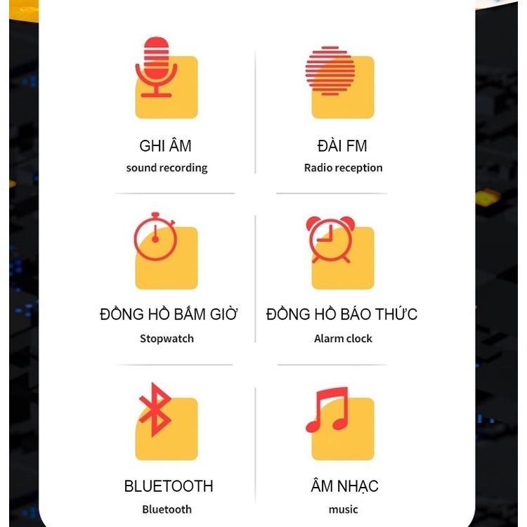 Chức năng:Bluetooth, Phát Nhạc, Ghi Âm, FM Radio, Đồng Hồ Báo Thức, Đồng Hồ Bấm Giờ