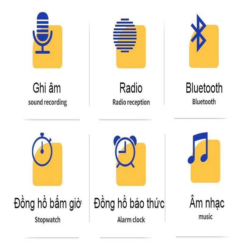 Chức năng:Bluetooth, Phát Nhạc, Ghi Âm, FM Radio, Đồng Hồ Báo Thức, Đồng Hồ Bấm Giờ