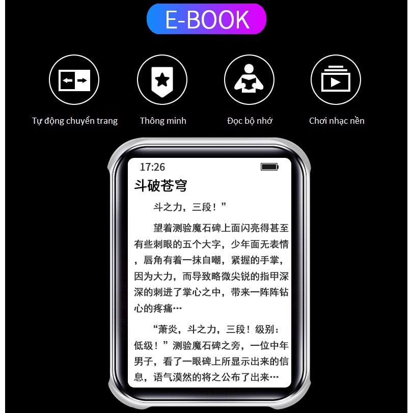 Chức năng: Bluetooth, Phát nhạc, Ghi âm, Đài FM, Đồng hồ bấm giờ, Đồng hồ báo thức, Video, Hình ảnh, Sách điện tử .
