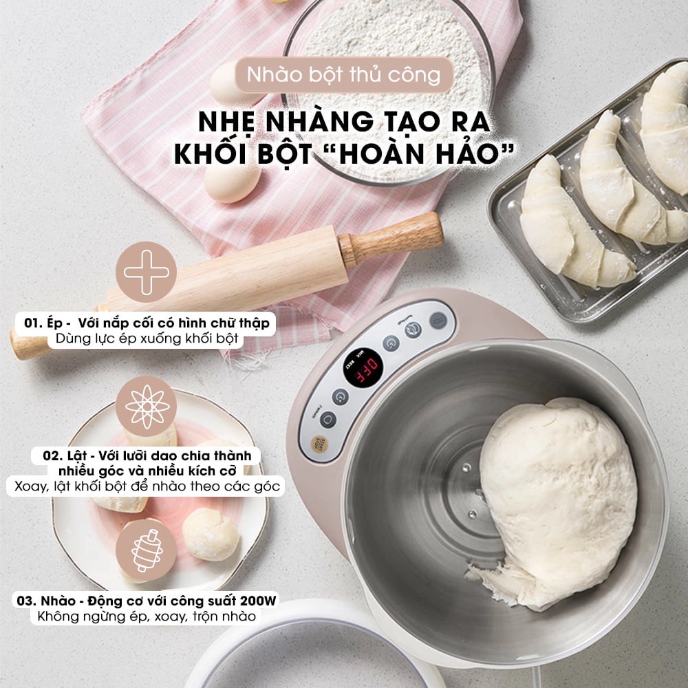 ✔️ Sở hữu công suất 200W, máy trộn bột 5L Bear - Máy đánh bột Bear hoạt động mạnh mẽ, vận hành êm ái, giúp bạn nhồi bột chỉ trong vòng từ 15-30 phút, tùy vào khối lượng bột. Bên cạnh đó, với lưỡi dao nhào chữ S đa góc, đa chiều kết hợp cùng trục xoáy động cơ một chiều DC, hỗn hợp bột của bạn sẽ được xoay, lật, nhào ở nhiều hướng khác nhau. Điều này đem lại thành phẩm bột mềm, mịn, dai đều, có độ đàn hồi tốt và có thể kéo dãn thành màng mỏng.✔️ Sau khi trộn bột, máy sẽ tiến hành ủ bột với mức nhiệt ổn định từ 35-40 độ C. Do đó, dù: Xuân, hạ, thu, đông; dù trời nắng hay mưa; lạnh hay nóng,.. khối bột sẽ luôn được ủ trong 1 điều kiện nhiệt độ duy nhất. Mức nhiệt này sẽ là môi trường tốt để kích thích men trong bánh hoạt động hiệu quả hơn cả. Men sẽ tạo các lỗ khí cho bánh, kích thích các sợi gluten trong bánh dày đặc hơn và tạo nên thành phẩm bột nở phồng, đạt mức nở hết cỡ, vô cùng hoàn hảo