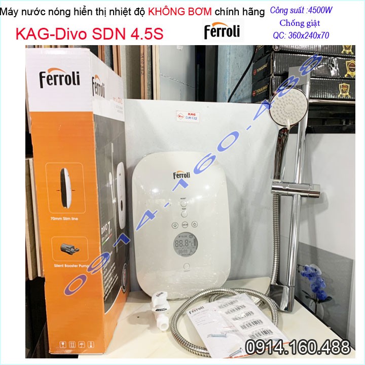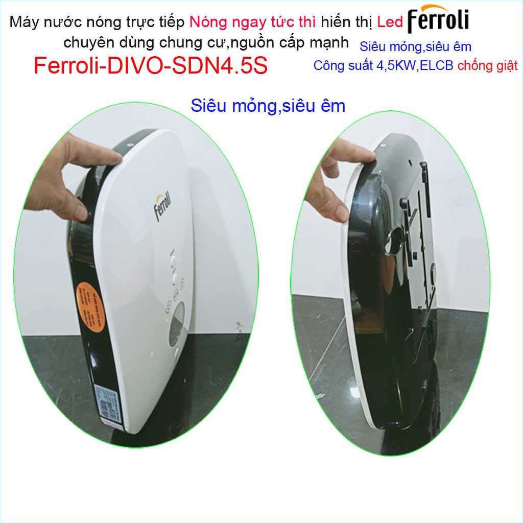Máy nước nóng Ferroli Divo SDN4.5S màn hình LED hiển thị nhiệt độ, Bình nước nóng trực tiếp Ferroli chính hãng ổn định nhiệt độ nước cho người già vàMáy nước nóng Ferroli được sản xuất tại nhà máy Ferroli -Italy, 1 thương hiệu hàng đầu về máy nước nóng, máy bơm nhiệt, thiết bị nhà bếp.