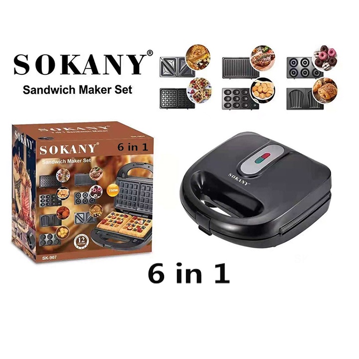 - Kẹp nướng bánh Sokany với thiết kế nướng 6 trong 1, với 6 bộ vỉ nướng đi kèm bạn có thể làm các loại bánh khác nhau như bánh sandwich, bánh waffle, bánh quy, bánh trứng,... hay nướng thức ăn trực tiếp ngay trên vỉ.