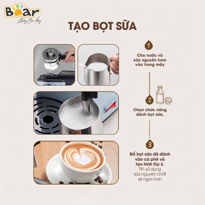 Để ly cà phê trở nên hấp dẫn hơn, máy pha cà phê Bear còn tích hợp thêm vòi đánh sữa tạo bọt như các máy pha cà phê chuyên nghiệp. Từ đó dễ dàng sáng tạo với cà phê tạo hình như cà phê latte, cappuchino, mocha,...