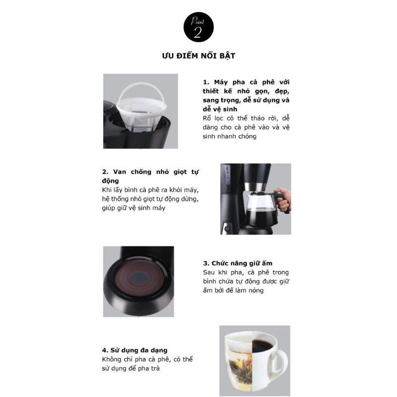 Thiết bị còn được trang bị cốc chứa bằng thủy tinh trong suốt, dễ dàng quan sát được quá trình pha bên trong với dung tích lên đến 1.5L, có khả năng pha từ 10 đến 12 ly cafe 1 lúc, rất phù hợp cho gia đình đông người hoặc ở cửa hàng, văn phòng làm việc, giúp bạn tiết kiệm thời gian mà vẫn đảm bảo chất lượng cà phê pha thơm ngon.