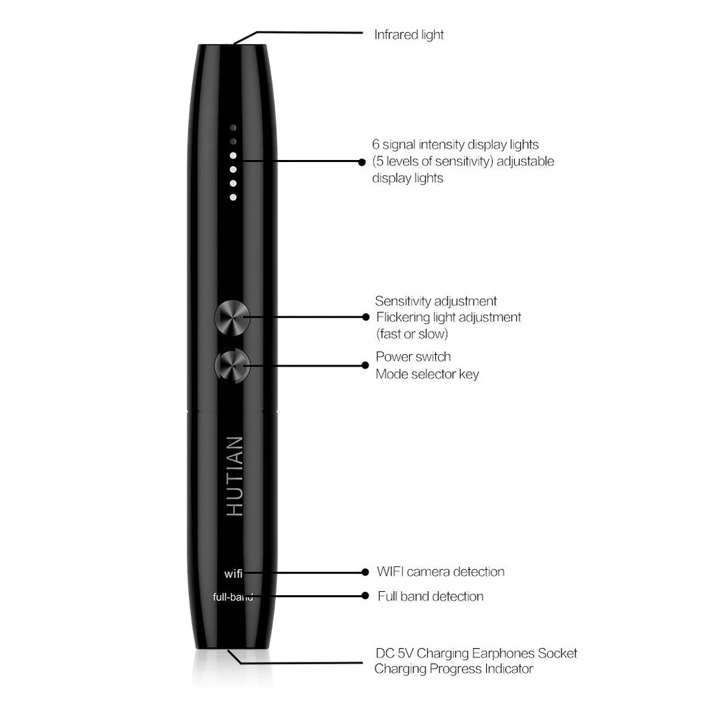 - Là một máy dò sóng vô tuyến, phản ứng với sóng vô tuyến của máy quay, ghi âm và sẽ nhanh chóng thông báo cho bạn khi phát hiện thiết bị khả nghi