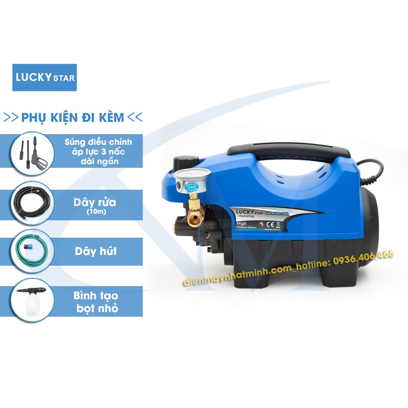 Máy phun rửa áp lực cao LuckyStar APW-HI-70A chính hãng là dòng máy chuyên dùng để , phun rửa áp lực cao rửa xe trong gia đình giúp cho bạn tiết kiệm được nhiều thời gian hơn khi rửa xe bằng tay hay phải đánh xe ra tiệm gây tốn kém và mất thời gian. Không những thế Máy phun rửa áp lực cao LuckyStar APW-HI-70A còn có thể dùng để tưới cây cảnh hay làm sạch cách đồ vật bị bụi bẩn.Thông số kĩ thuật của máy phun rửa áp lực cao LuckyStar APW-HI-70A