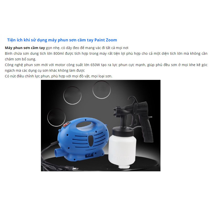 - Việc dọn dẹp, tân trang căn phòng của bạn có thể dễ dàng hơn với Máy phun sơn cầm tay Painter Zoom sản phẩm chuyên dụng giúp cho việc trang trí phòng ốc, nhà cửa. Bạn có thể sơn lại căn phòng của mình thật đơn giản và không tốn nhiều thời gian như trước đây nữa. Máy phun sơn cầm tay là sản phẩm tiện dụng dành cho gia đình bạn với tính năng phun sơn đều, mịn… không chỉ thế máy giúp sơn nhanh, tiện lợi, tiết kiệm sức và thời gian so với các sơn thông thường.
