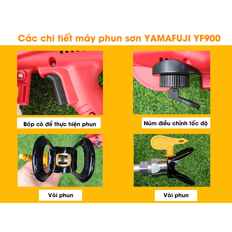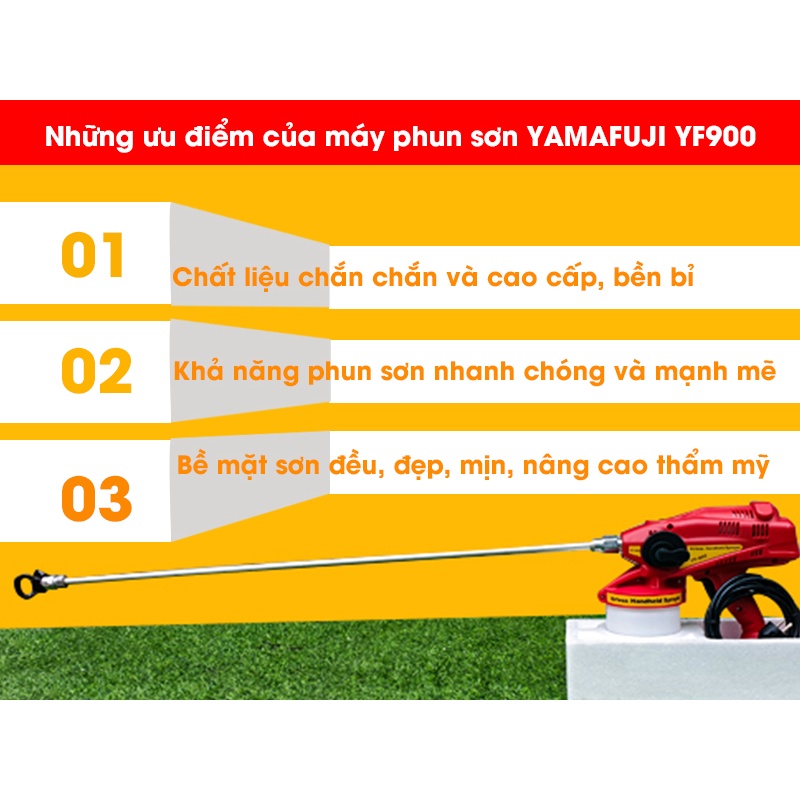 - Yamafuji YF900 là dòng máy phun sơn cầm tay chạy điện, được thiết kế kiểu dáng nhỏ gọn, dễ dàng di chuyển và đem đi mọi nơi.