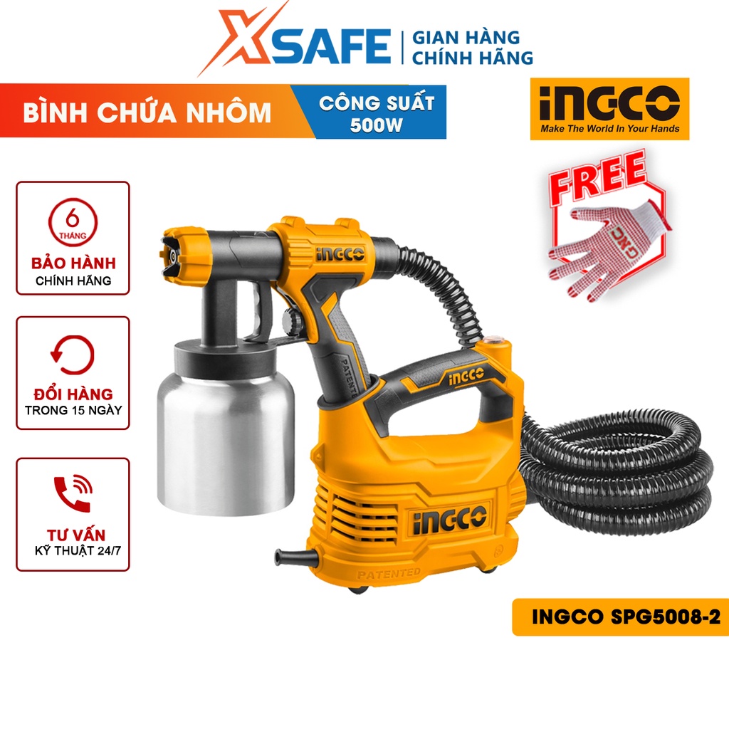 Máy phun sơn điện cầm tay INGCO SPG5008-2 500W đầu béc 2.5mm, bình chứa nhôm 800ml - bảo hành chính hãng 6 tháng - xsafe