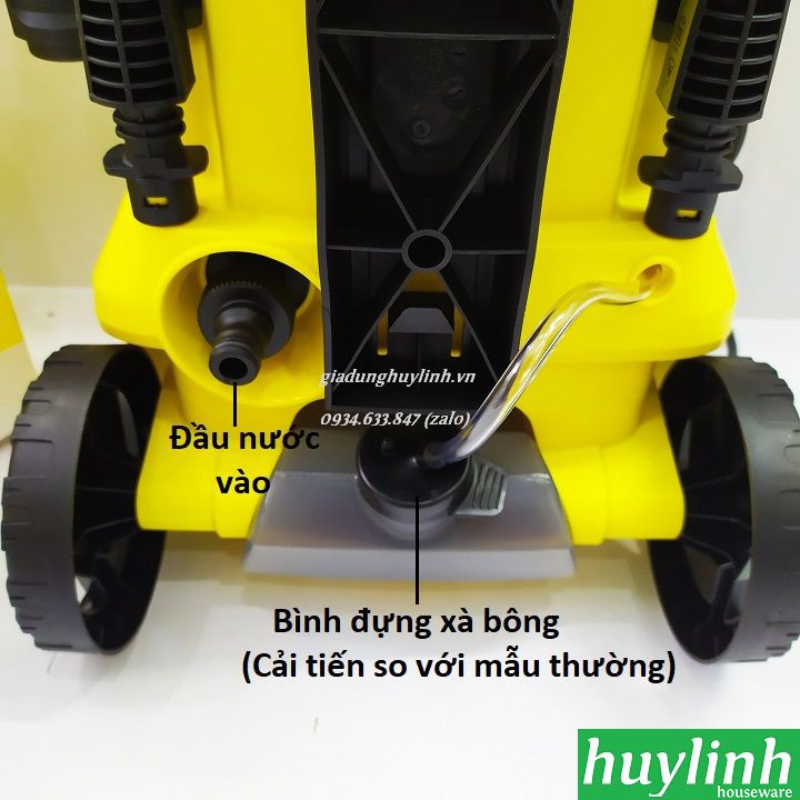 - Trên thân máy có khoang chứa dung dịch tạo bọt rửa xe, khi đổ dung dịch vào máy sẽ tự động pha trộn dung dịch với nước để tạo bọt phun rửa xe.