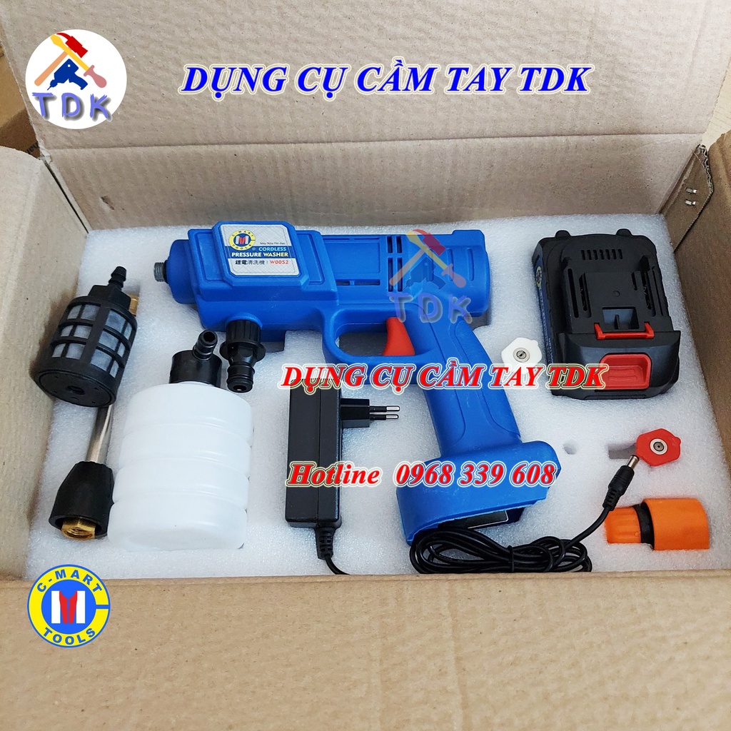 - Sản phẩm bao gồm: Thân máy + 01 Pin lithium 21v + bộ sạc + bình bọt + thanh nối dài bằng thép không gỉ + đầu nối nhanh + ổ cắm nước + ống dẫn nước