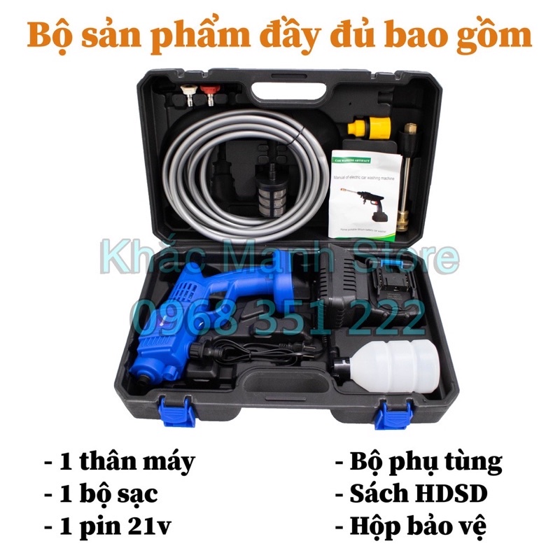 - Thân máy + Pin lithium 88Vf/15Ah + bộ sạc + bình bọt + thanh nối dài bằng thép không gỉ + đầu nối nhanh + ổ cắm nước 0 độ + ổ cắm nước 40 độ + ống dẫn nước 5 mét