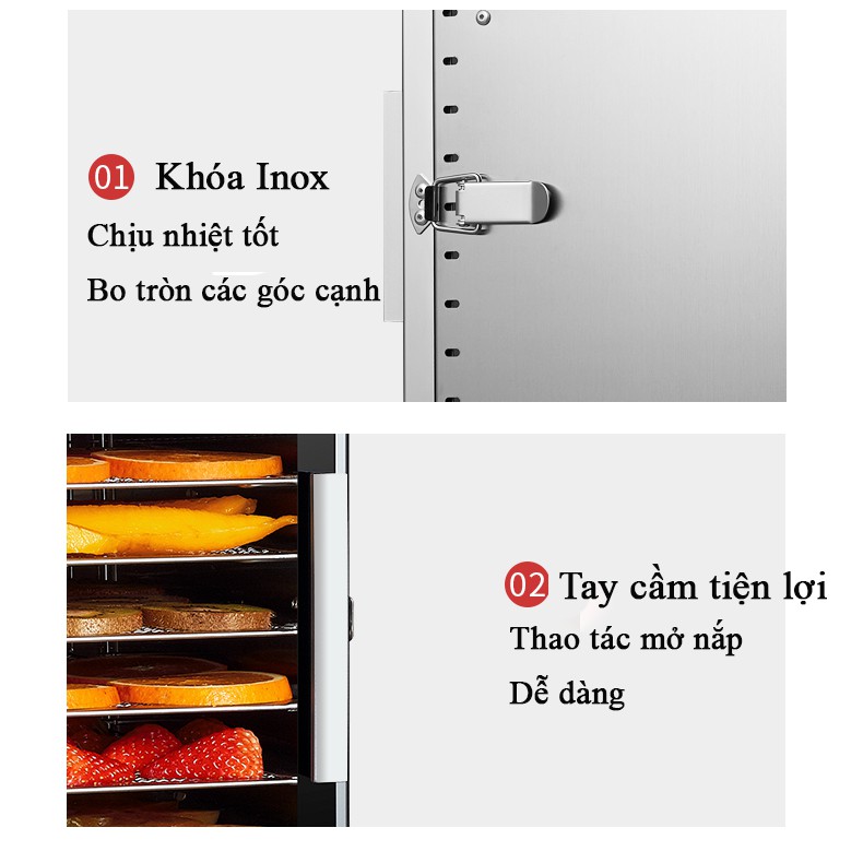 - Chất liệu thép chống gỉ 304 với nắp mở tích hợp tay cầm tiện lợi, cùng kính cường lực chịu nhiệt giúp quan sát quá trình sấy bên trong.