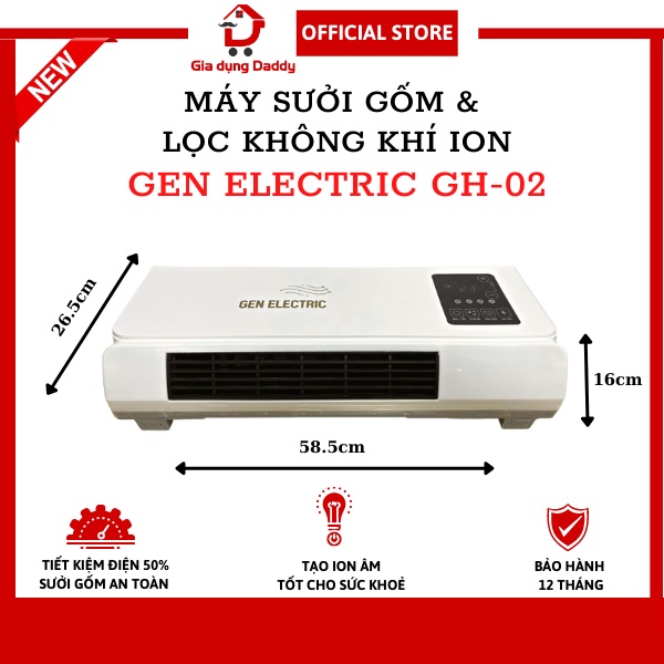 - Máy sưởi gốm lọc không khí ion Gen Electric GH-02 sử dụng công nghệ PTC làm nóng an toàn, tiết kiệm điện tới 50% so với các dòng máy sưởi thông thường khác