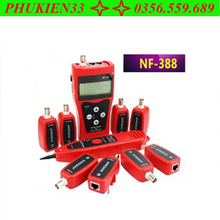 Máy test cable Mạng đa năng RJ 45, RJ 11, USB, cáp đồng trục, Model NF-388, với màn hình hiển thị LCD, đo được số mét, số feet trên chiều dài đoạn dây, xác định đựơc vị trí đứt và nhiều tính năng khác như sau: