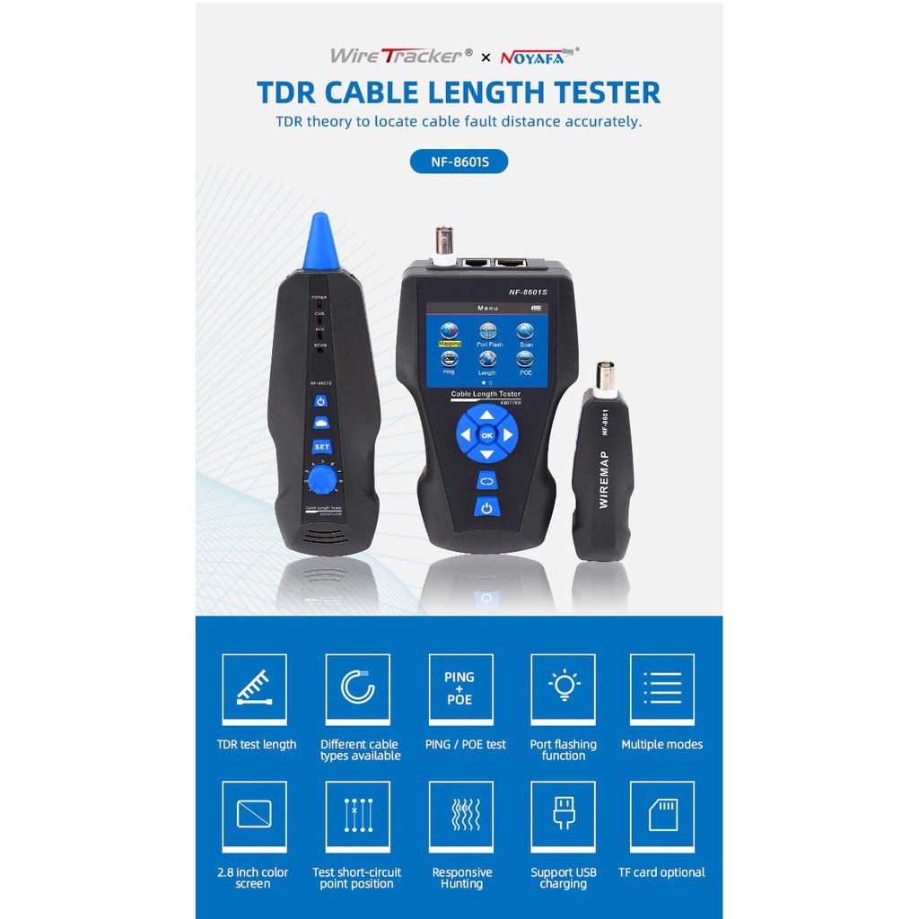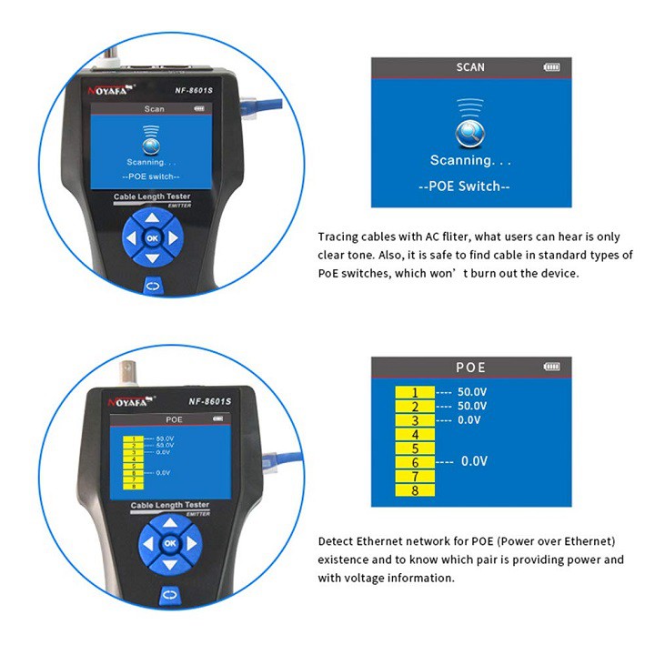 Bên cạnh đó, việc tìm kiếm cáp dễ dàng hơn và truy tìm với AC fliter, hoặc định vị cổng mạng sử dụng hub blink tính năng. NF-8601S cũng kiểm tra các sự hiện diện của PoE và PING chức năng.