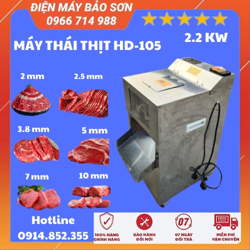 Giới thiệu Máy Thái Thịt Công Nghiệp HD105 Thay Được Dao Máy Cắt Thịt Tươi Sống Công Suất 2.2kw Inox Cỡ Dao 2.0-2.5-3.8-5.0-7-10mm