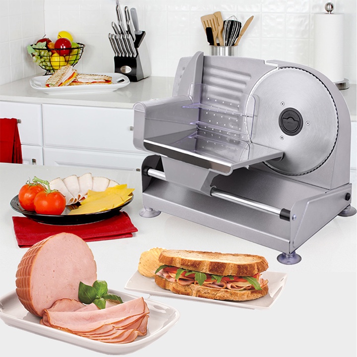 - Đường kính lưỡi dao lớn 190mm cắt được các khối thịt độ dày từ 1-15mm.