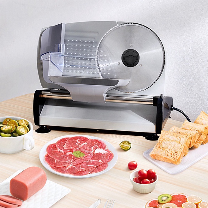- Đường kính lưỡi dao lớn 190mm cắt được các khối thịt độ dày từ 1-15mm.