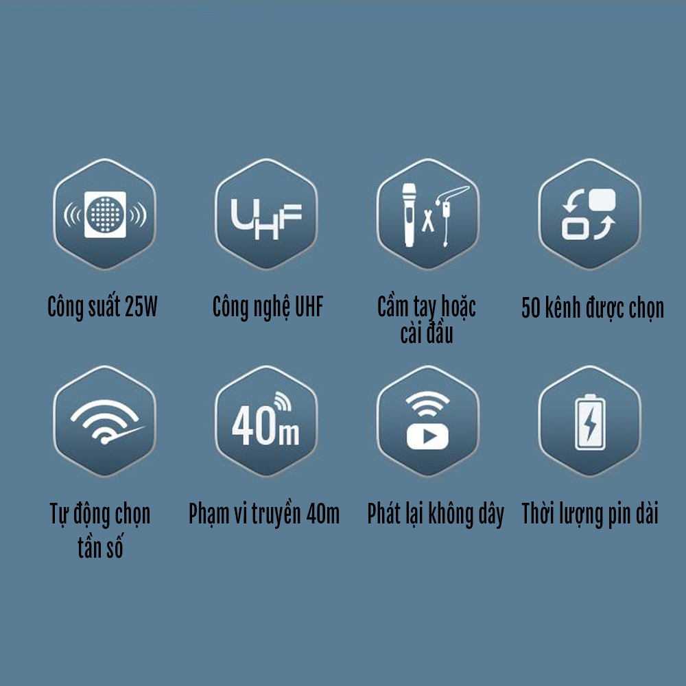 - Công nghệ không dây UHF công suất cao 25W, tùy chọn phiên bản đeo đầu hoặc phiên bản cầm tay, có 50 kênh để lựa chọn