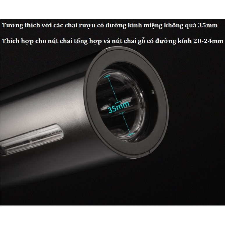 - Máy tương thích với miệng các chai rượu vang có đường kính không quá 35mm, thích hợp với các nút chai có chất liệu tổng hợp hoặc nút chai gỗ có đường kính từ 20-24mm