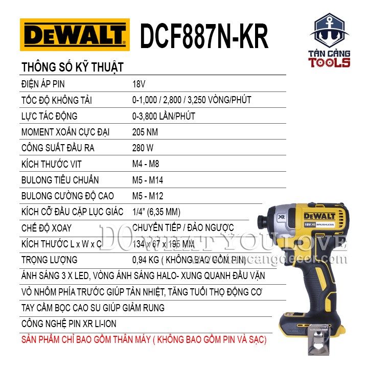 - Máy Vặn Vít Dùng Pin DeWalt 18V DCF887N-KR ( Thân Máy ) trang bị động cơ không chổi than mạnh mẽ, cho mô-men xoắn cao đến 205N.m (tương đương những máy vặn bu-lông dùng điện cỡ nhỏ).