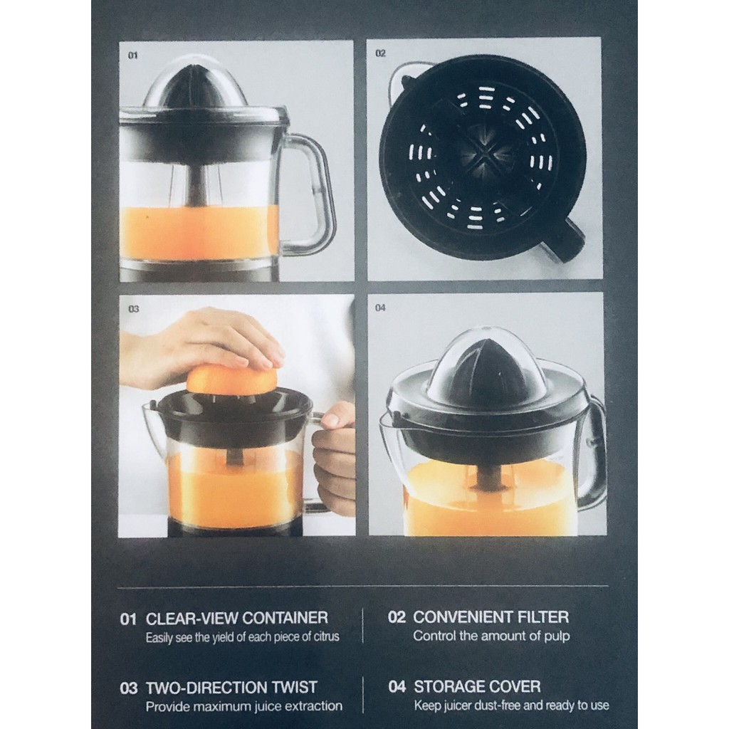 - Đặc biệt, sản phẩm trang bị bình đựng trong suốt giúp bạn quan sát được lượng ép bên trong. Nắp đậy bảo vệ bên ngoài và nắp đậy đầu vắt bên trong giúp bảo vệ kín đáo, ngăn ngừa bụi bẩn, vi khuẩn xâm nhập hiệu quả. Quai cầm dày chắc kết hợp cùng miệng rót trên bình đựng giúp bạn thực hiện các thao tác cầm nắm, rót nước ép dễ dàng.