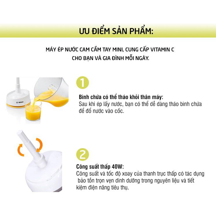 Máy sử dụng đơn giản, nhẹ nhàng, bạn chỉ cần ấn nhẹ miếng trái cây đặt trên nón ép là đã khởi động cho thiết bị thực hiện công việc ép nước cam. Sản phẩm sở hữu thiết kế nhỏ gọn với màu sắc trang nhã, không chỉ mang đến cho gia đình bạn những ly nước trái cây thơm ngon, bổ dưỡng mà còn góp phần tô điểm cho không gian bếp thêm tiện nghi, hiện đại.