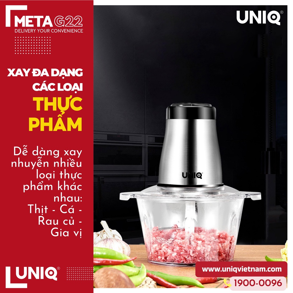 Máy Xay, Cối Xay Thịt Cá, Rau Củ Đa Năng UNIQ Meta G22 2L Lưỡi Dao Kép Không Rỉ, Cối Thủy Tinh Cao Cấp