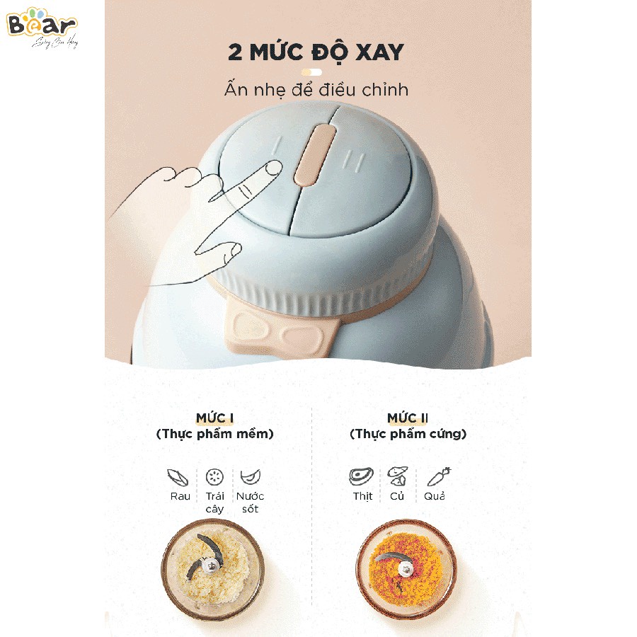 Dung tích 0.6L, bạn có thể xay nhuyễn các nguyên liệu để làm món ăn cho bé với lượng thức ăn thành phẩm sau xay đạt 200 gram, tương đương với 1 bát. Máy xay cho bé ăn dặm Bear mini 0.6L cực kỳ thích hợp khi bạn cần xay một lượng nhỏ thức ăn, giúp cho thực phẩm luôn tươi ngon mà không bị biến đổi màu sắc hay hương vị. Đặc biệt, sản phẩm tích hợp 2 chế độ xay✔️ Mức xay 1: Xay thực phẩm mềm, thích hợp xay rau, trái cây mọng nước, nước sốt, gia vị,...