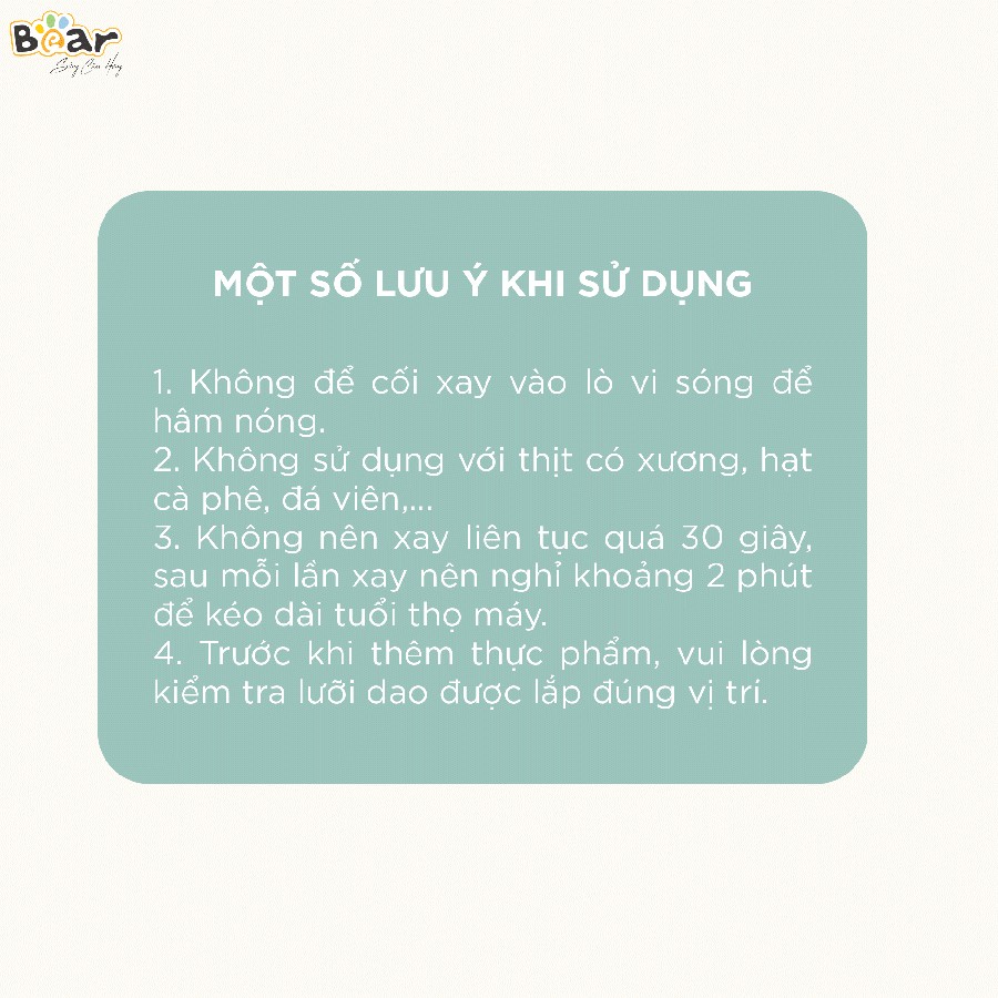 - Không nên xay liên tục quá 30 giây, sau mỗi lần xay nên nghỉ khoảng 1-2 phút để kéo dài tuổi thọ của máy