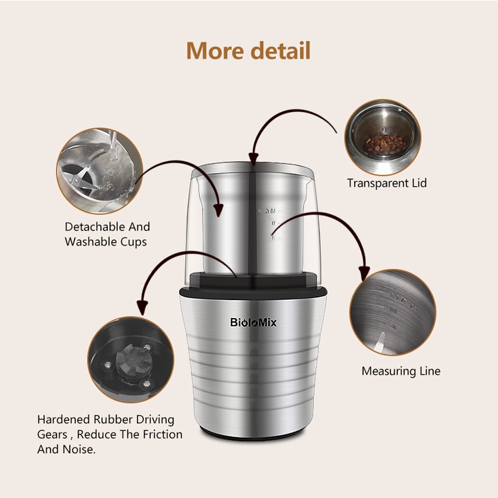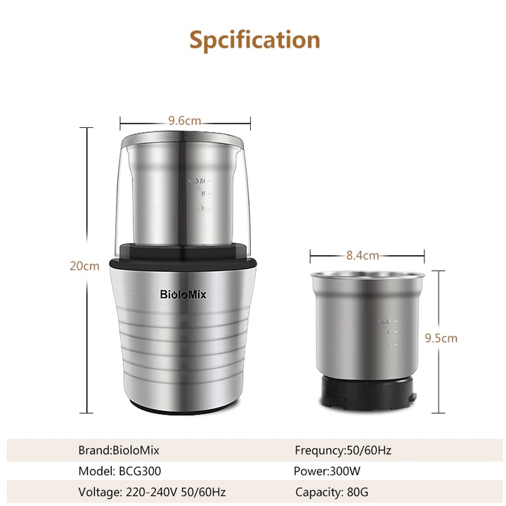 ▶ Máy xay cà phê và gia vị Biolomix BCG300 có vỏ bọc inox SS201 siêu bền, được thiết kế hiện đại, nhỏ gọn và dễ dàng sử dụng, có lưỡi dao được làm bằng thép không gỉ cao cấp cùng động cơ 300W mạnh mẽ, giúp bạn xay mịn hạt cà phê một cách nhanh chóng mà vẫn đảm bảo giữ được hương vị và chất lượng của thực phẩm.