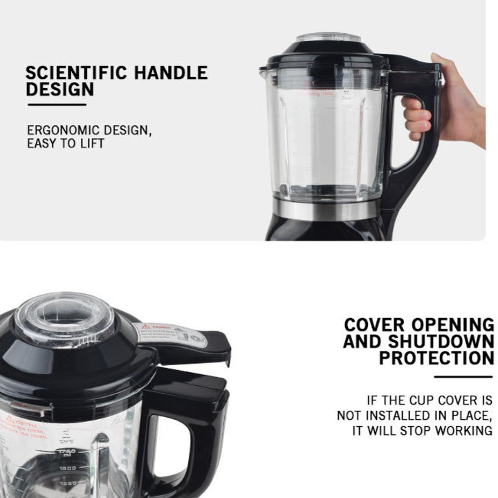 - Cối trộn của Máy làm sữa hạt đa năng sử dụng chất liệu thủy tinh dày, an toàn với thực phẩm, chịu nhiệt tốt. Nắp cối tích hợp công tắc thông minh, tức là máy chỉ vận hành chỉ khi người dùng đã đóng chặt nắp. Việc này giúp bạn có thể yên tâm mỗi khi sử dụng, tránh thương tổn cho cơ thể khi bạn đứng gần trong lúc làm việc.