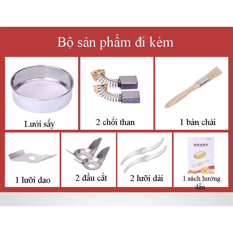 12.Bộ tiện ích đi kèm sản phẩm rất tiện dụng gồm: bộ lọc, bộ lưỡi dao xay thay thế, chổi than, dụng cụ mở máy xay và chổi vệ sinh máy xay cũng như quét cối xay.