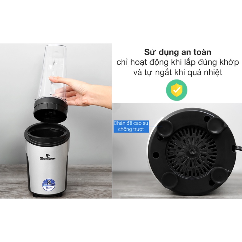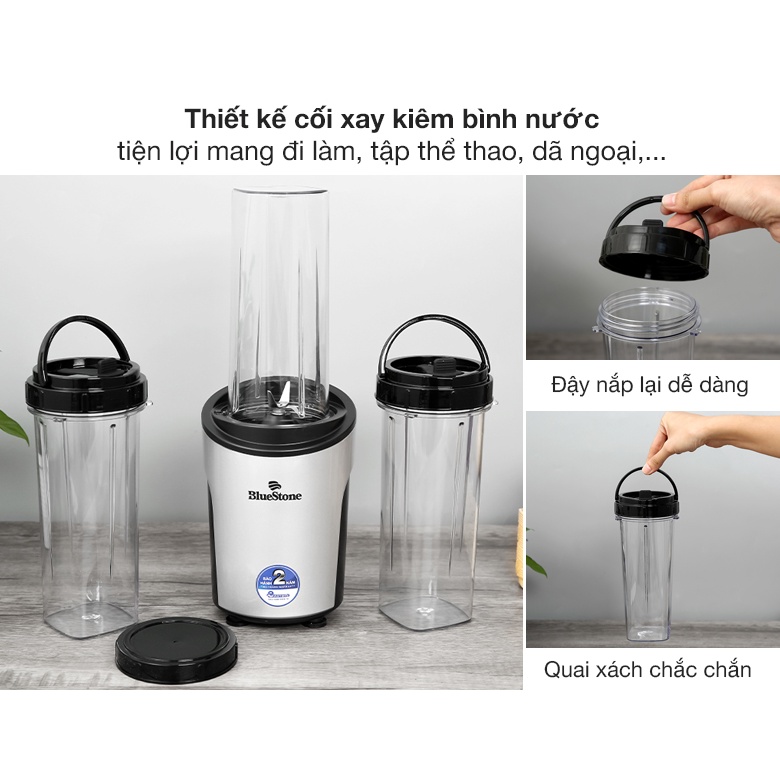 Máy xay sinh tố Bluestone có 3 cối xay kiêm bình nước được thiết kế nhỏ gọn, màu sắc trang nhã, đáp ứng nhu cầu xay sinh tố mang đi làm, tập thể thao, dã ngoại,...